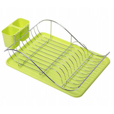 Dish drying rack 49 × 32 × 12.5 cm (green), 0761A, KAMILLE. A dish drying rack with a tray and a side cutlery holder. Made of chrome-plated steel; the tray and cutlery holder are made of plastic. Length: 49 cm. Width: 32 cm. Height: 12.5 cm. Available in green.