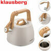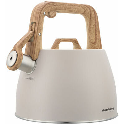 Traditional kettle 2.5l, meringue Klausberg, KB 7917. Made of high-quality stainless steel – durable and easy to clean. A stylish combination of a beige body and a wood-effect handle for a natural effect. Equipped with a whistle to signal when the water is boiling. Total capacity 2.5 l (usable 2.0 l) – suitable for families and guests. Suitable for all types of cookers: gas, induction, halogen and electric. Ergonomic handle and convenient opening of the spout with one hand.